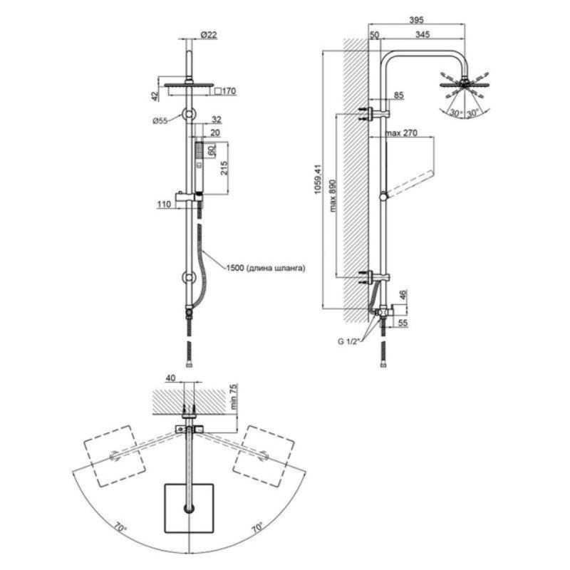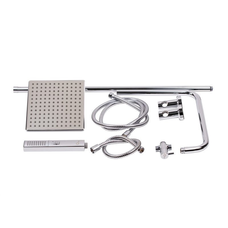 Комплектация | Кронштейн для верхнего душа, лейка для верхнего душа, кронштейн для ручного душа, лейка для ручного душа, душевой шланг, душевая стойка, шланг подключения, крепежи. |
