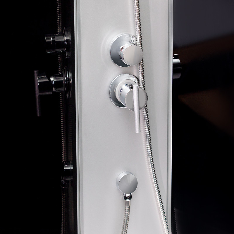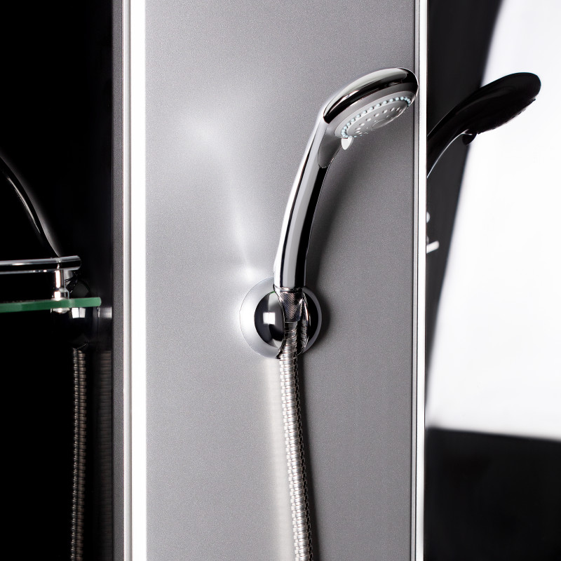 Комплектация | Піддон, сифон, двері, ручки, ролики, профіль, комплект кріпильних деталей, задня стінка, панель, змішувач, лійка для ручного душа, лійка для верхнього душа, душової шланг, кронштейн, ніжки, верхня кришка, скляна полиця. |