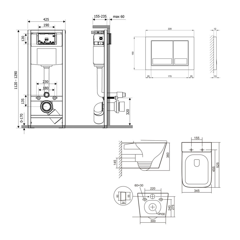 Дополнительные характеристики | Звукоизоляционная прокладка - есть. Количество режимов слива воды - 2. Быстрая регулировка по высоте 1120-1290 мм и глубине 155-235 мм. Межосевое расстояние креплений унитаза - 155 мм. Направление выпуска - горизонтальное. Объем смывного бачка - 8 л. Функция микролифта сиденья - есть. |