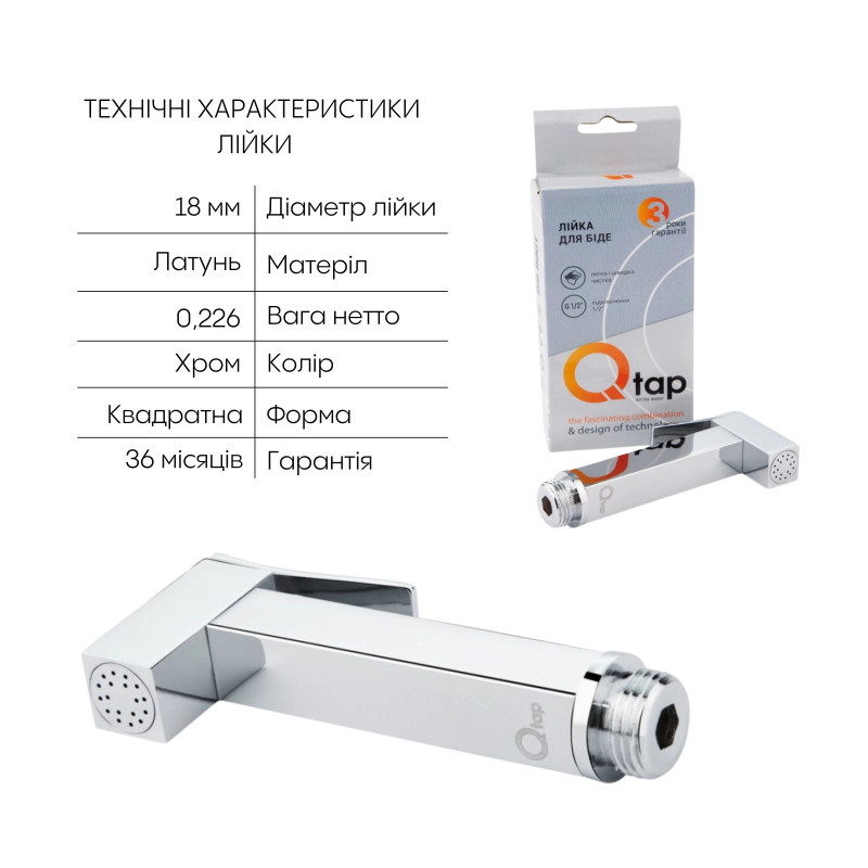 Комплектация | Смеситель (QTVLA6228102NC), подключение (QTCRMBH030), лейка (QTCRMB120), шланг (QTHADPVC120C) |