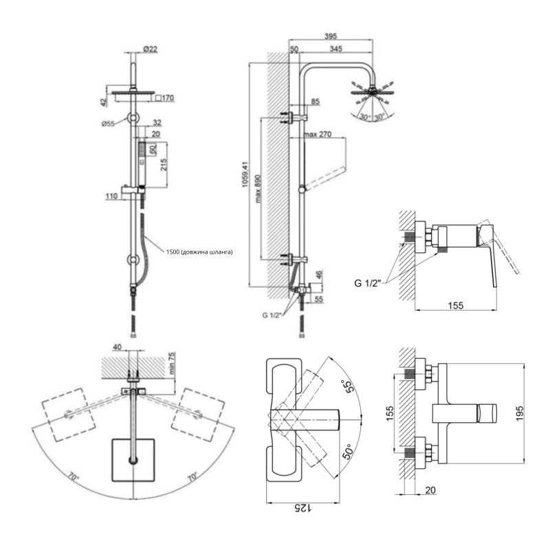 Материал | Латунь / ABS пластик - душевая стойка; латунь - смеситель |