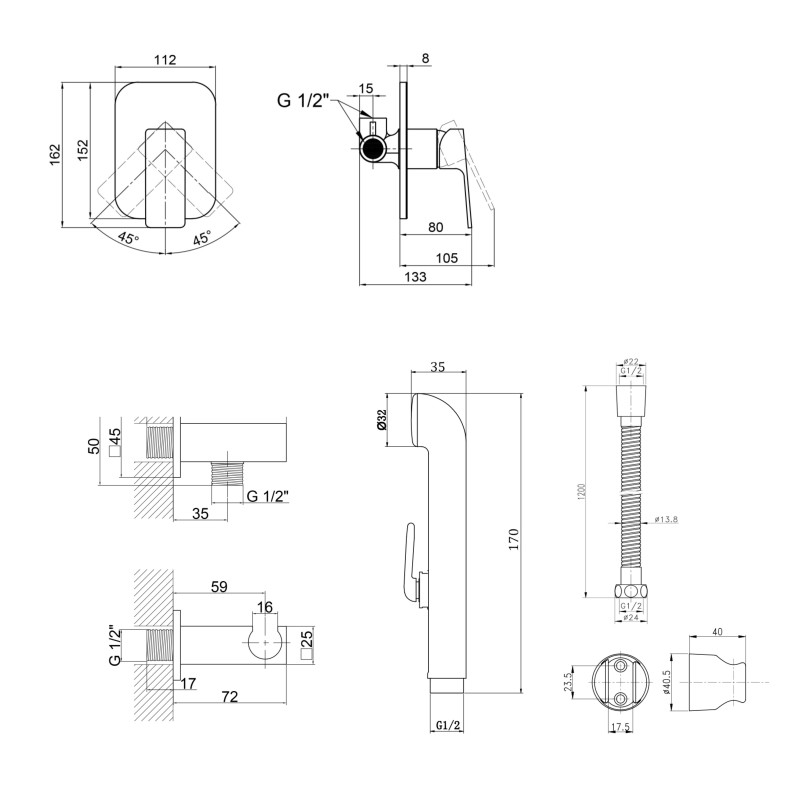 Материал | Латунь - смеситель, подключение; ABS пластик - набор для гигиенического душа |