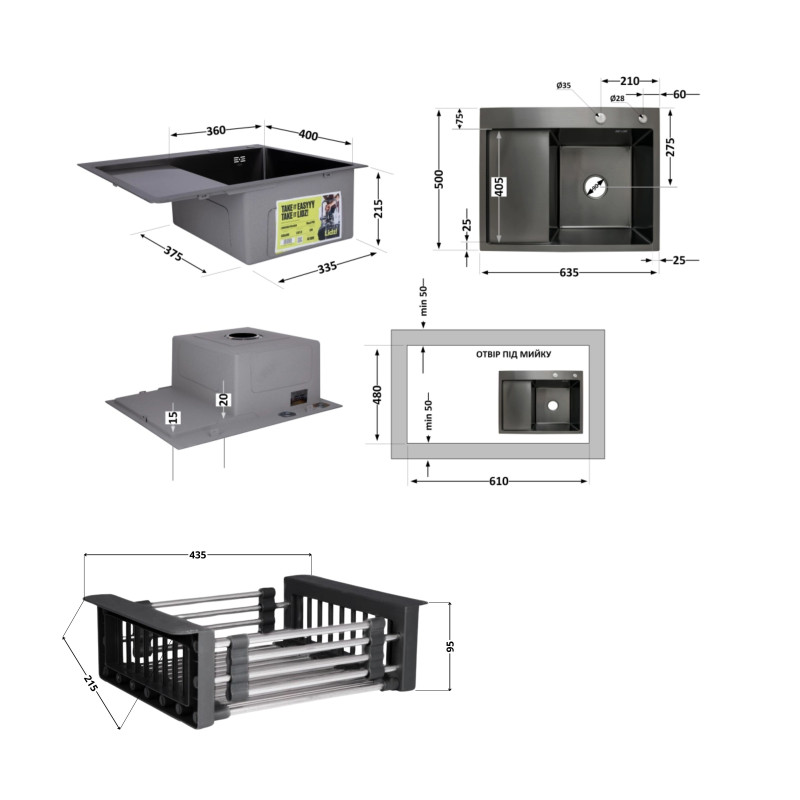 Комплектация | Мойка (LDH6350BRPVD45590), корзина (LIDZK01B) |