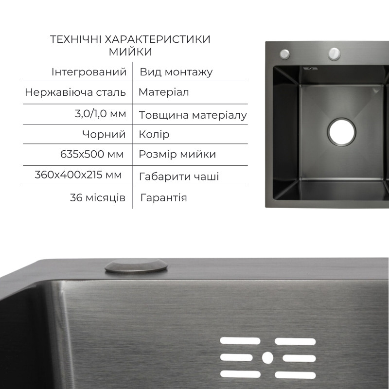 Комплект Lidz Handmade H6350BR (BlackPVD) включает черную мойку с правым крылом, дозатор и корзину Lidz K01B. Прекрасный выбор для любителей лаконичного дизайна.