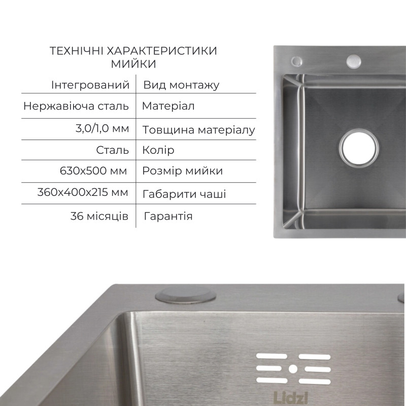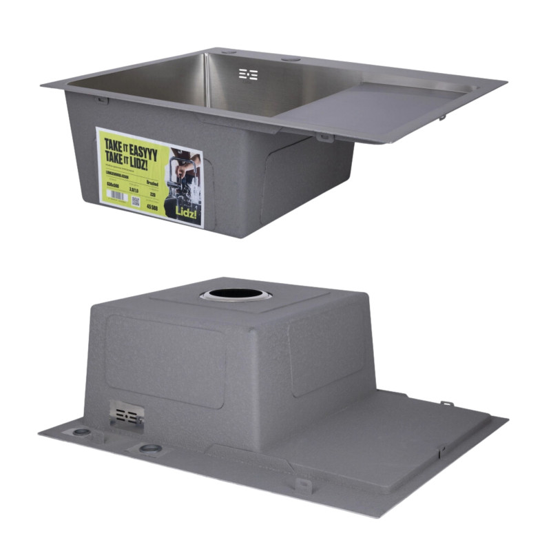 Комплект Lidz Handmade H6350R (Brushed) сочетает интегрированную мойку с правым крылом и шлифованной поверхностью Brushed, а также дозатор и корзину Lidz K01G для максимального удобства.