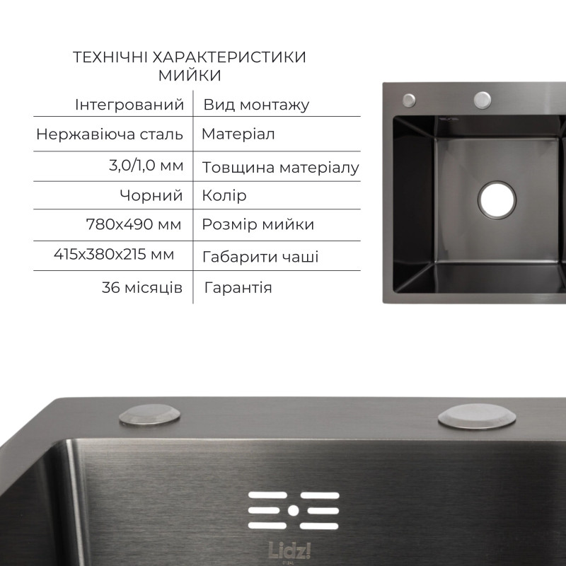 Комплект Lidz Handmade H7849BR (BlackPVD) предлагает просторную черную мойку с правым крылом, дозатор и корзину Lidz K01B, обеспечивая удобство и красоту.
