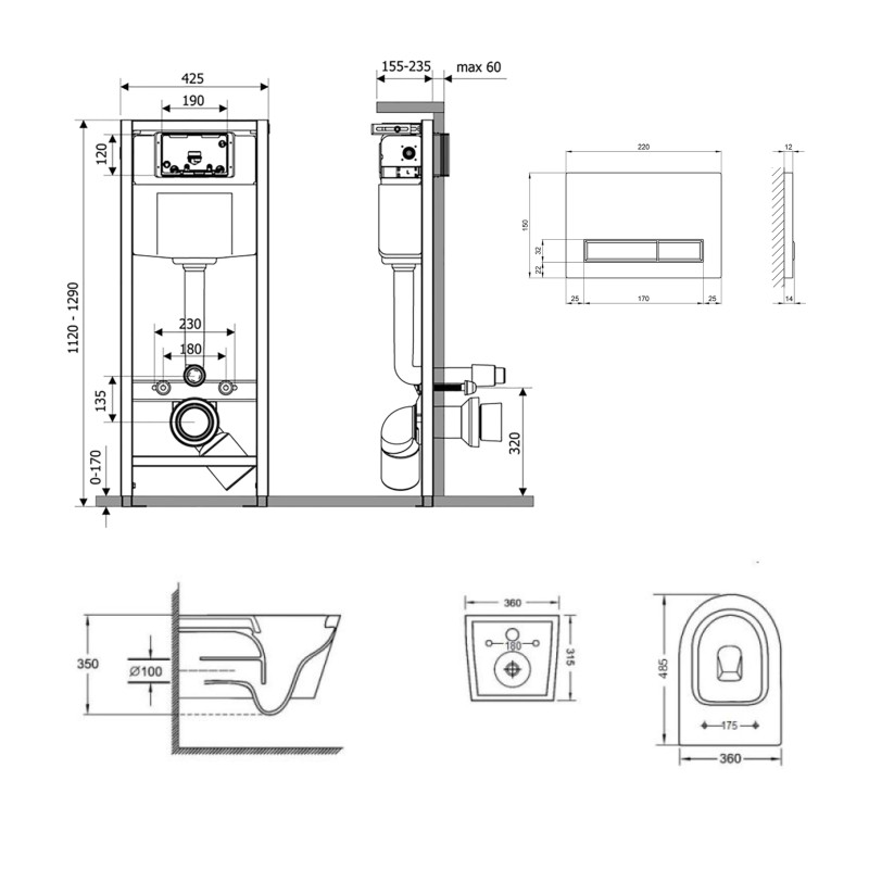 Габариты изделий (ВхШхД), мм | Унітаз: 350х360х520. Сидіння для унітазу: 35х367х455. Інсталяція: 1280х425х185. Панель змиву: 150х220х14. |