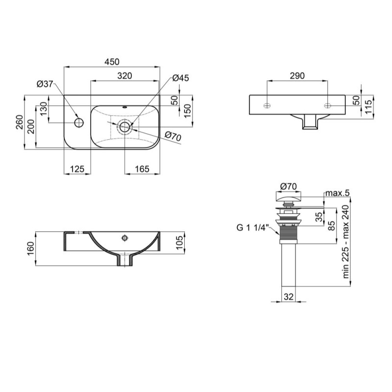 Комплект Qtap Tern: Раковина подвесная прямоугольная левая 450х260х155 мм White + Донный клапан PU02O: Компактная подвесная раковина для установки слева. Ее размеры (450х260х155 мм) идеально подходят для небольших помещений, а белый цвет и современный дизайн добавляют эстетичности.
