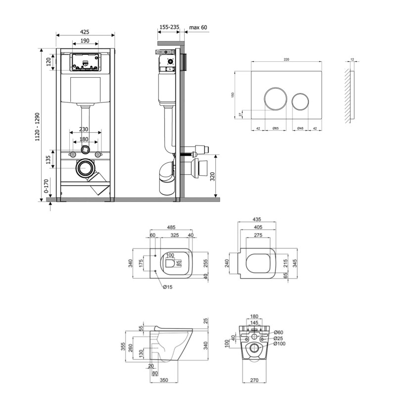 | Габариты изделий (ВхШхД), мм | Унітаз: 355х340х485. Сидіння для унітазу: 55х345х435. Інсталяція: 1280х425х185. Панель змиву: 150х220х32. |
