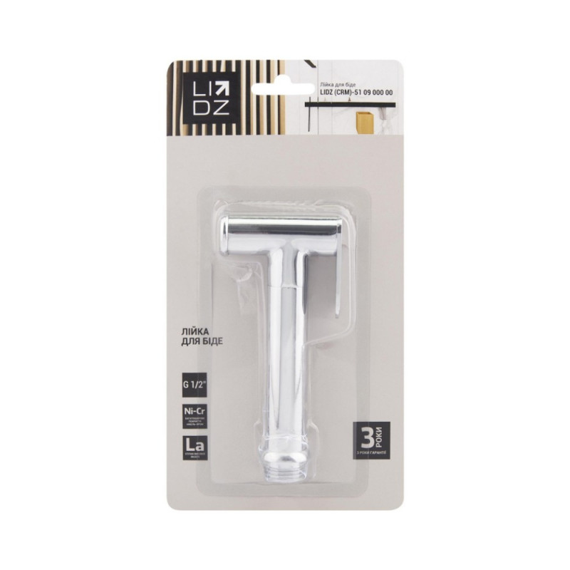 Лійка для гігієнічного душу Lidz (CRM) 51 09 000 00 виконана з латуні, тому прослужить довгі роки й запобіжить появі корозії. На ручку нанесено фірмовий логотип виробника. Лійка монтується без особливих зусиль та додаткових підручних засобів. Вона компактна, не забере багато місця, тому пасуватиме навіть маленьким приміщенням. Подача води відбувається тільки при натисканні на клапан.
