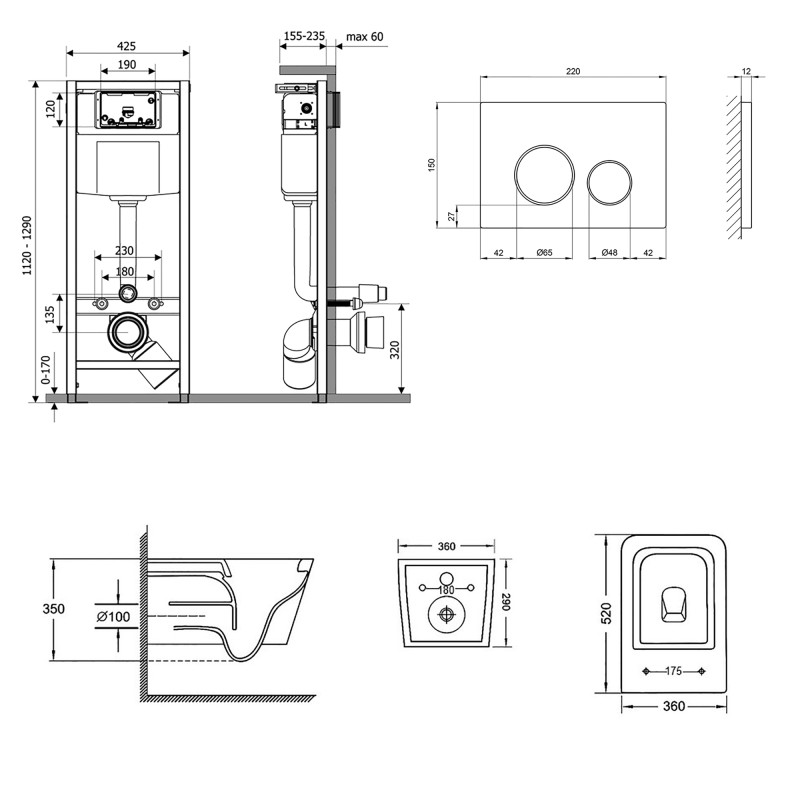 Габариты изделий (ВхШхД), мм | Инсталляция: 1280х425х235. Панель смыва: 150х220х12. Унитаз: 350х360х520. Сиденье для унитаза: 50х350х445. |