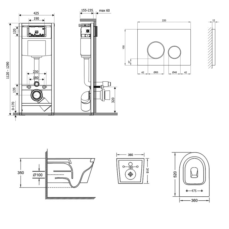 Габариты изделий (ВхШхД), мм | Инсталляция: 1280х425х235. Панель смыва: 150х220х12. Унитаз: 350х360х520. Сиденье для унитаза: 35х367х455. |