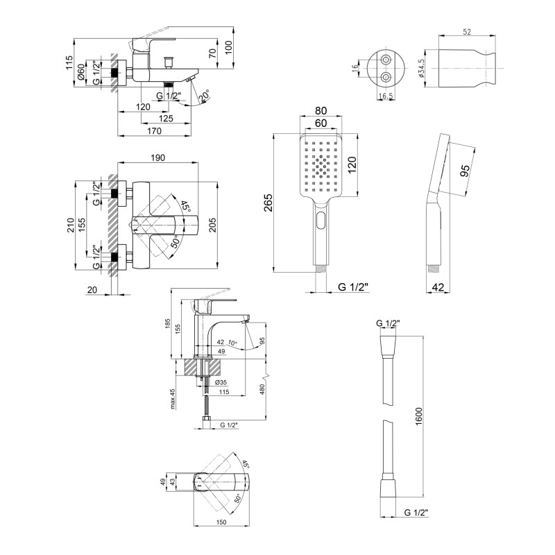 Набор смесителей Qtap 5 в 1 Lipno для ванны с душевым гарнитуром (QTLIPNO1023101CB + QTNH3023101DCB) чёрный