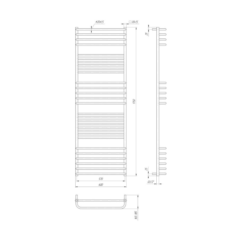 изготовлен из нержавеющей стали АІSI 304. Изделие имеет межосевое расстояние для подключения 570мм, диаметр подключения G 1/2''. Состоит полотенцесушитель из 29 ребер. Может быть оборудован электрическим ТЭНом.