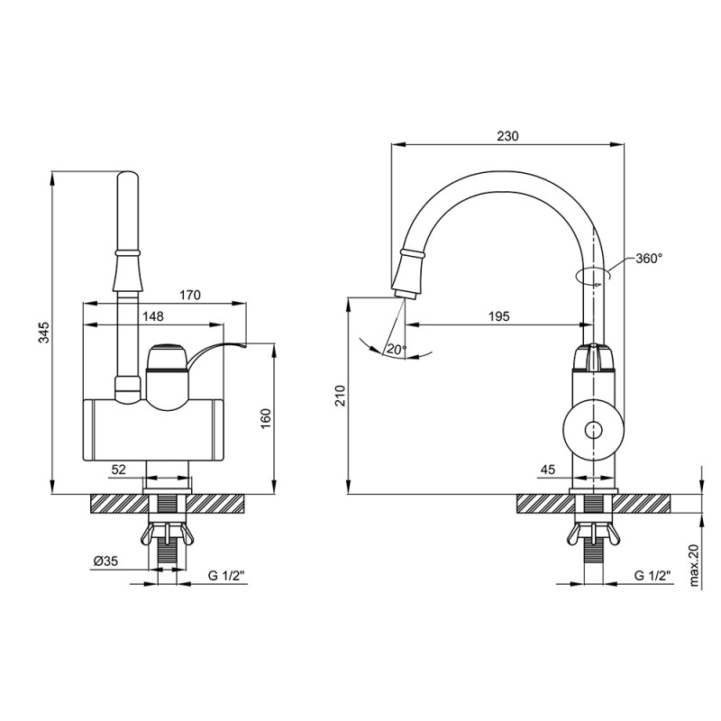 Кран для кухні проточний Lidz (WCR) 95 00 058 виготовлений з нержавіючої сталі. Призначений для швидкого нагріву проточної води з побутовою метою. Підмикається до магістралі холодного водопостачання за допомогою гнучкого шланга діаметром 1/2 "з тиском від 0.04 до 0.5 МПа і побутової електричної мережі 220 В, 50 Гц.