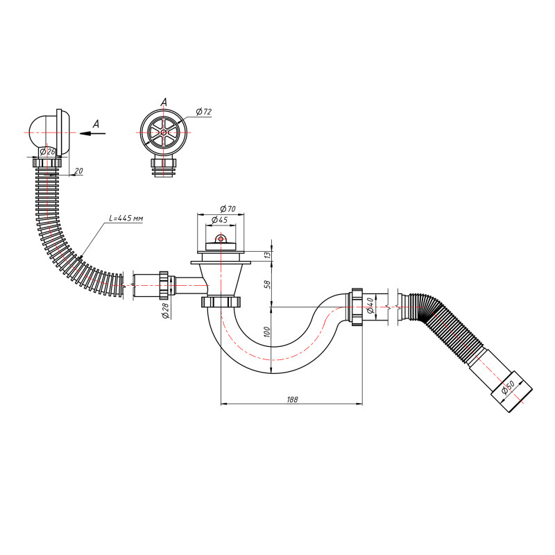 Дополнительные характеристики | Длина перелива: 445 мм. Длина гофрированной трубы: 235 - 425 мм. |