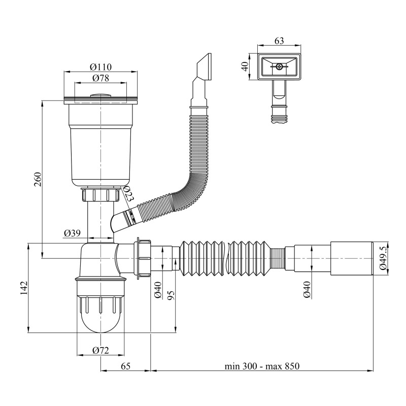 Сифон LK15 для кухонной мойки Bruch PVD, выпуск 115 мм колбовый с квадратным переливом Black (выход гофры 40/50мм) Lidz