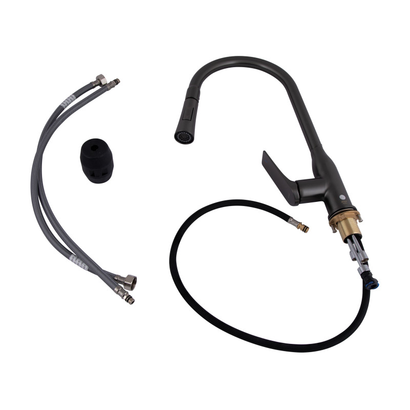 Смеситель для кухни с выдвижным изливом Qtap Vlasta New QTVLA344GMB45647 изготовлен из высококачественной латуни с PVD покрытием в цвете оруженной стали, что обеспечивает долговечную бесперебойную работу изделия. Благодаря выдвижной форме излива можно легко очистить труднодоступные места на посуде. Управление температурой и напором воды осуществляется с помощью удобного рычага.