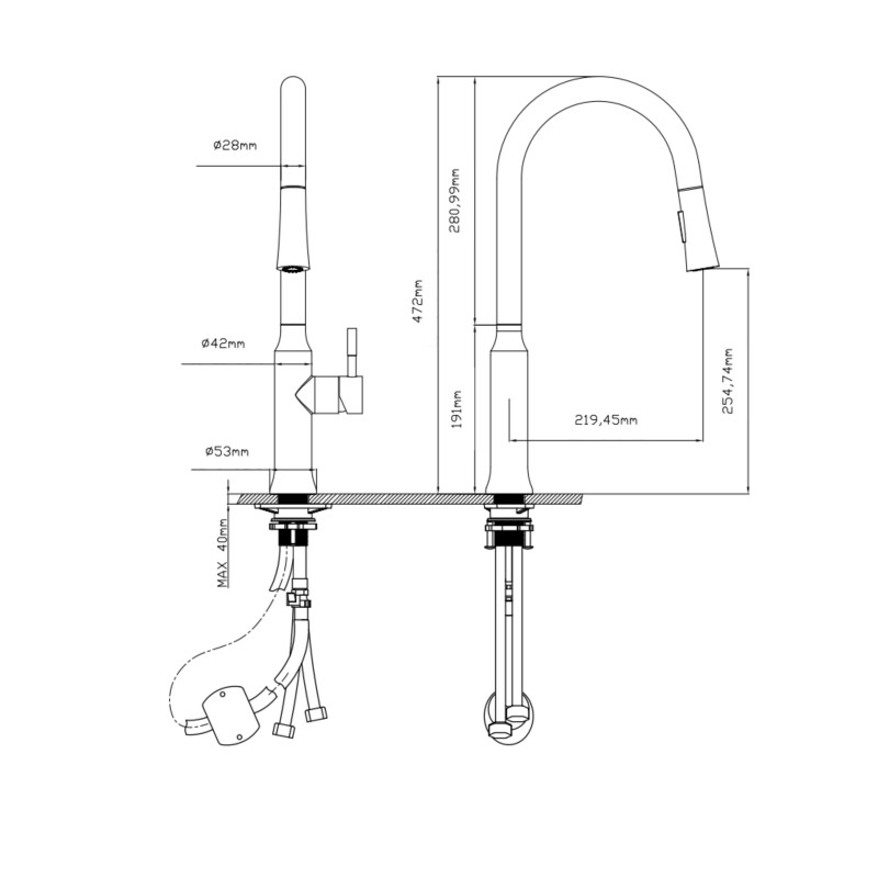 Комплектация | Смеситель, шланг для выдвижной лейки, гибкая подводка, ключ для аэратора, крепежи, якорь. |