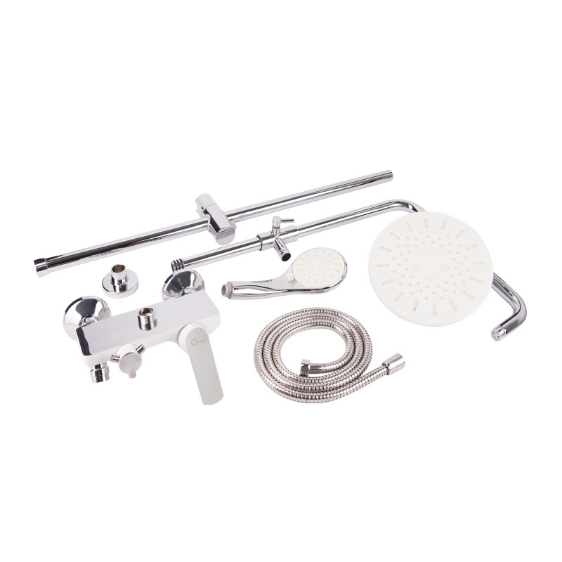 Комплектація | Смеситель с полкой, кронштейн для верхнего душа, лейка для верхнего душа, кронштейн для ручного душа, лейка для ручного душа, душевой шланг, душевая стойка, крепежи. |
