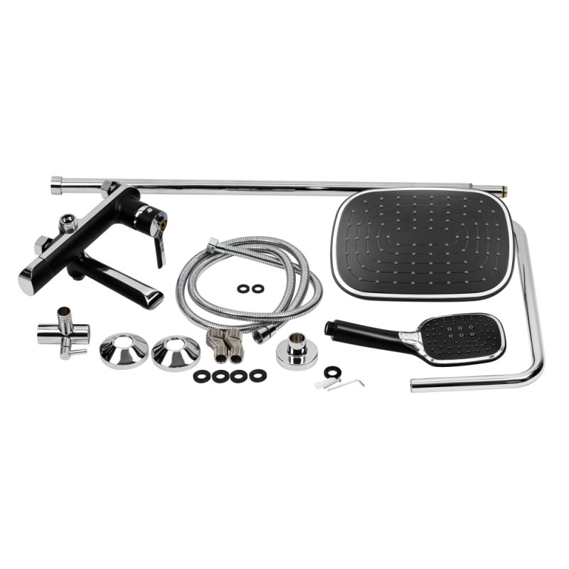 Комплектація | Смеситель, кронштейн для верхнего душа, лейка для верхнего душа, кронштейн для ручного душа, лейка для ручного душа, душевой шланг, душевая стойка, крепежи. |