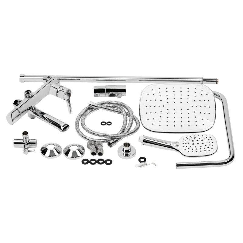 Комплектація | Смеситель, кронштейн для верхнего душа, лейка для верхнего душа, кронштейн для ручного душа, лейка для ручного душа, душевой шланг, душевая стойка, крепежи. |