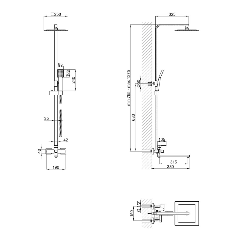 Діаметр лійки, мм | Ручной душ: 85х105. Верхний душ: 250х250 |