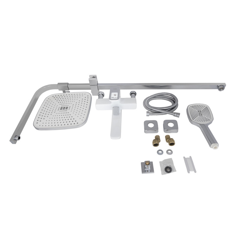 Комплектація | Смеситель, кронштейн для верхнего душа, лейка для верхнего душа, кронштейн для ручного душа, лейка для ручного душа, душевой шланг, душевая стойка, крепежи. |