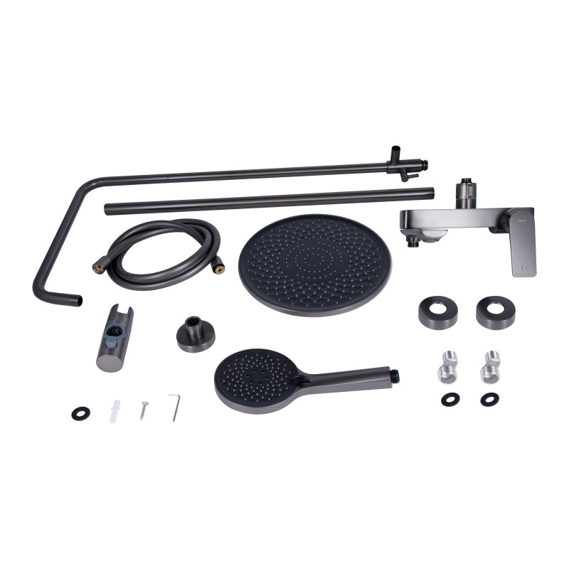 Комплектація | Смеситель, кронштейн для верхнего душа, лейка для верхнего душа, кронштейн для ручного душа, лейка для ручного душа, душевой шланг, душевая стойка, крепежные детали. |