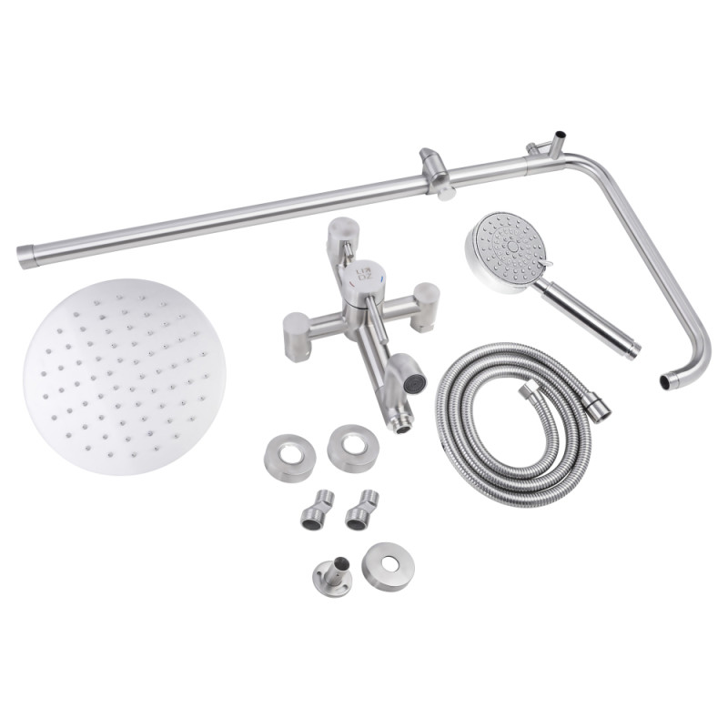 Комплектація | Змішувач, кронштейн для верхнього душу, лійка для верхнього душу, кронштейн для ручного душу, лійка для ручного душу, душовий шланг, душова стійка, кріпильні деталі. |