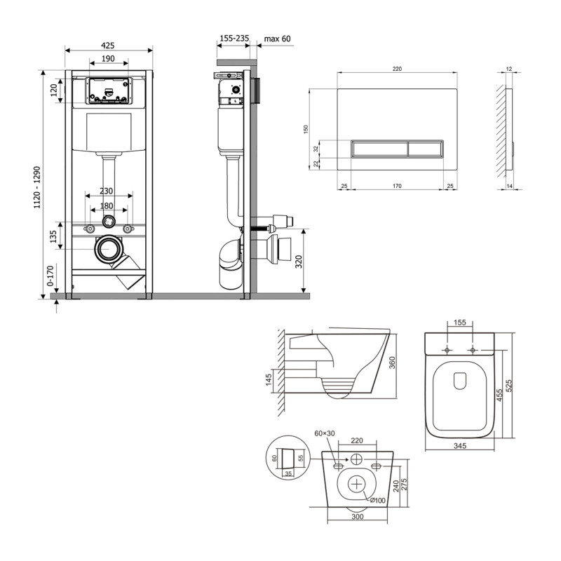 | Габаритные размеры изделия (ШхГхВ), мм | 345х525х360 - унитаз; 425х185х1280 - инсталляция; 220х13х150 - панель смыва |
