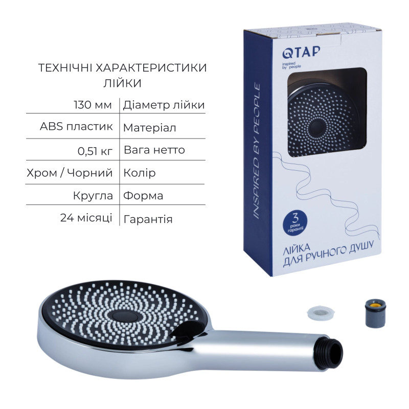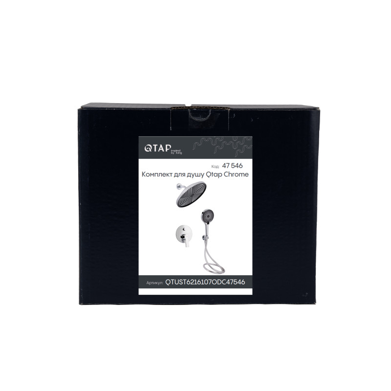 Комплектація | Смеситель (QTUST6216107ODC), лейка для ручного душа (QTRUC125CRM45952), лейка для верхнего душа (QTHLA107CRM45948), шланг (QTHADPVC200C), подключение (QTCRMBH030) |