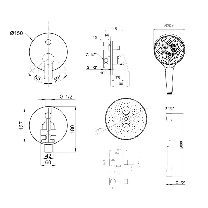 Вага брутто, кг | 1,65 - смеситель; 0,6 - лейка для ручного душа; 1,7 - лейка для верхнего душа; 0,425 - шланг; 0,3 - подключение |