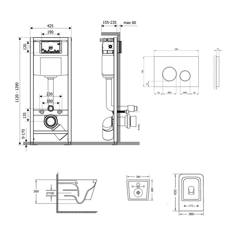 Габарити виробів (вхшхд), мм | Унитаз: 350х360х520. Сиденье для унитаза: 35х365х455. Инсталляция: 150х350х445. Панель смыва: 150х220х30. |