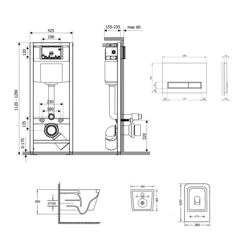 Габарити виробів (вхшхд), мм | Унитаз: 350х360х520. Сиденье для унитаза: 35х365х455. Инсталляция: 150х350х445. Панель смыва: 150х220х32. |