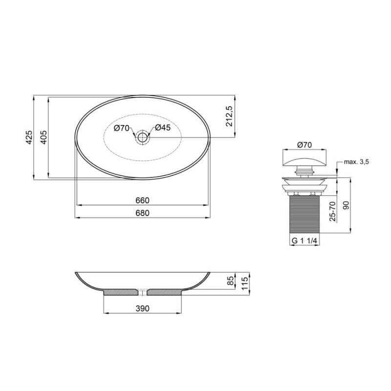 Габаритные размеры изделия (ШхГхВ), мм | 425х680х115 - раковина; 70х70х225 - донный клапан |