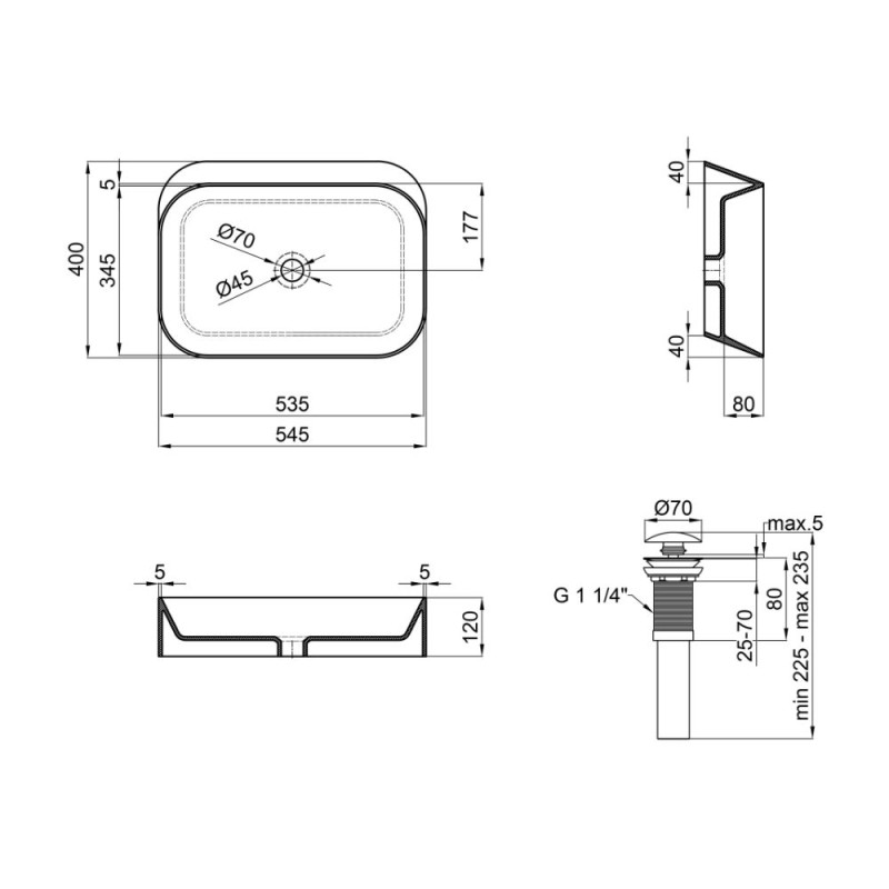 Габаритные размеры изделия (ШхГхВ), мм | 400х545х120 - раковина; 70х70х225 - донный клапан |