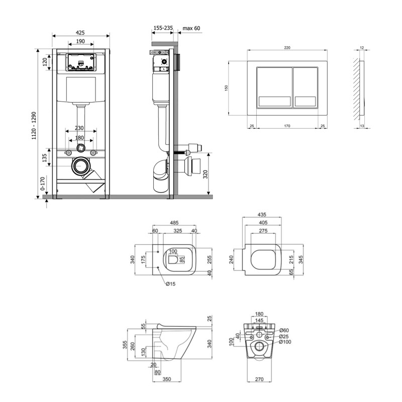 | Габарити виробів (вхшхд), мм | Інсталяція: 1280х425х185. Панель змиву: 150х220х13. Унітаз: 355х340х485. Сидіння для унітазу: 55х345х435. |