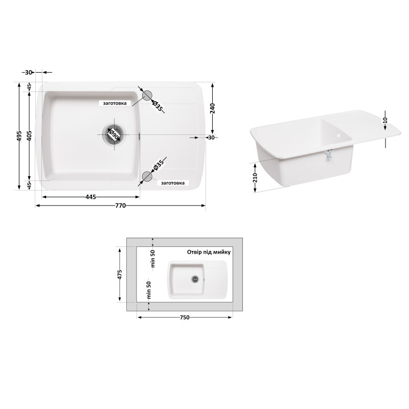 Кухонна мийка Lidz 770x490/200 WHI-01 (LIDZWHI01770490200) виготовлена ??з якісного штучного каменю, має матову поверхню і буде добре виглядати у поєднанні зі змішувачем того ж кольору. Виріб монтується урізним способом у підготовлений отвір в стільниці. Мийка виконана з робочою чашею та крилом, на ній є отвір зливник-перелив та заготовка для отвору під змішувач. Відмінна якість та дизайн мийки задовольнять найвибагливі вимоги.