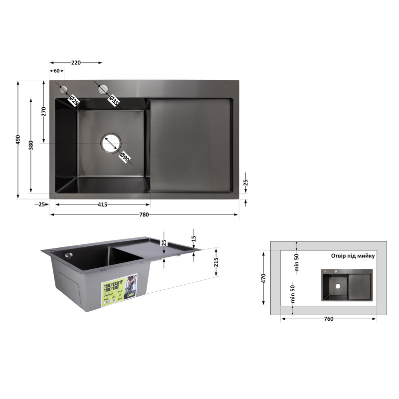Комплектація | Мойка, дозатор, сифон, слив/перелив, корзинчатый вентиль, крепежи. |