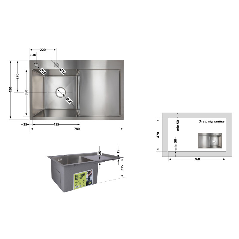 Комплектація | Мойка, дозатор, сифон, слив/перелив, корзинчатый вентиль, крепежи. |