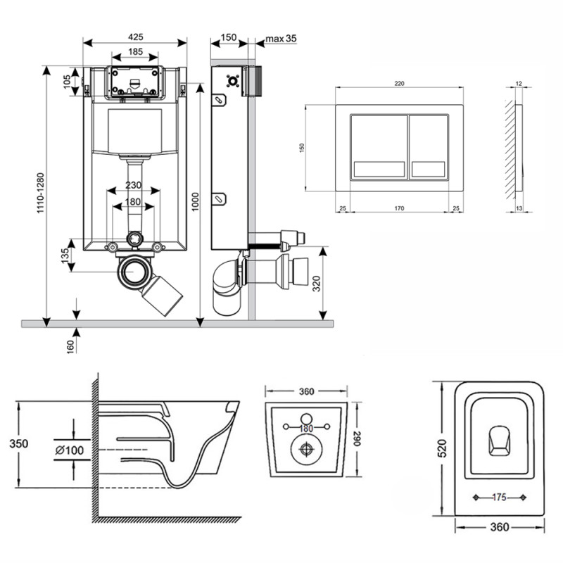 | Габарити виробів (вхшхд), мм | Инсталляция: 1280х425х235. Панель смыва: 150х220х13. Унитаз: 350х360х520. Сиденье для унитаза: 50х350х445. |