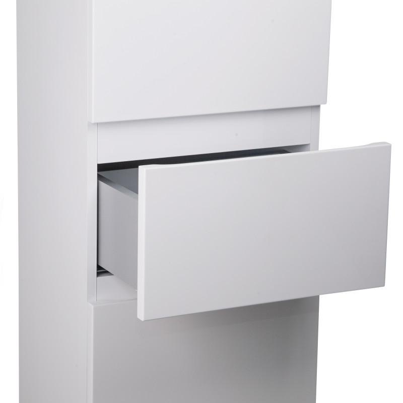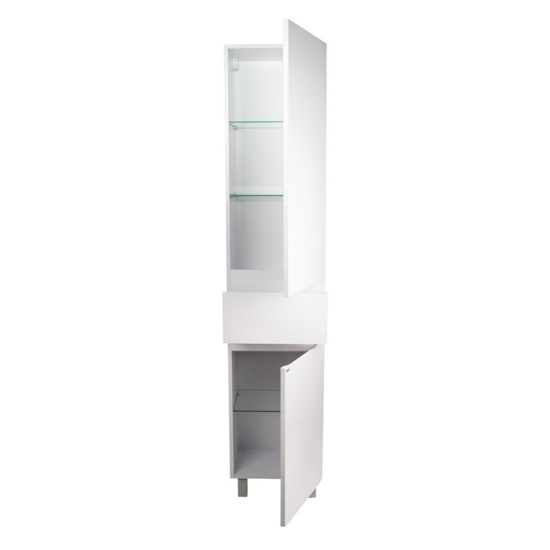 Підлоговий пенал Qtap Albatross QT0175PN1900DRW виготовлений з ДСП з двошаровою ламінацією білого кольору, фасадна частина з МДФ з глянцевим покриттям. Оснащений двома відділеннями з одностулковими дверима, в яких розташовані полички зі скла, і висувним ящиком з механізмом доводчика. У комплекті чотири хромовані ніжки з пластика. Пенал Q-tap Albatross WHI PN1600DR виконаний в елегантному лаконічному стилі, який впишеться в дизайн будь-якої ванної кімнати.