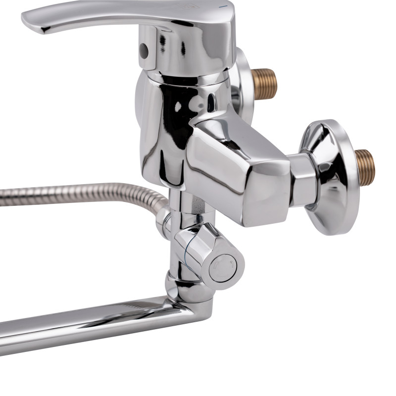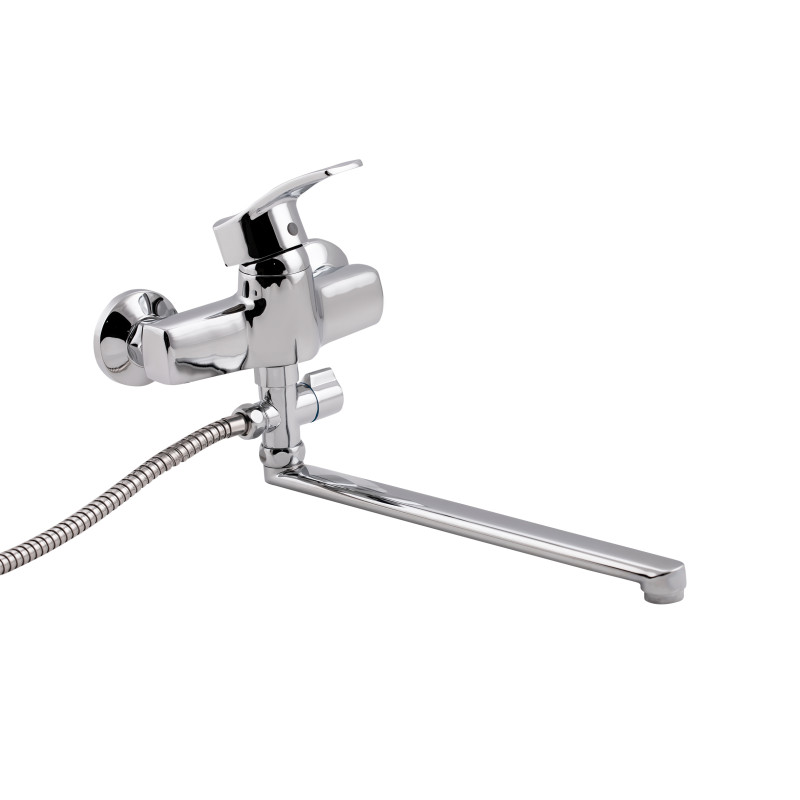 Змішувач для ванни Lidz (CRM) 41 86 005C-2 з довгим поворотним виливом виготовлено з цинку, укомплектовано кронштейном для ручного душу, душових шлангом і лійкою. Завдяки хромованому покриттю має міцну поверхню і привабливий зовнішній вигляд. Декоративні розетки приховають похибки установки на оздобленні кімнати. Напір води і її температура регулюються поворотом важеля в необхідне положення. Перемикання ванна/душ здійснюється за допомогою дивертора.
