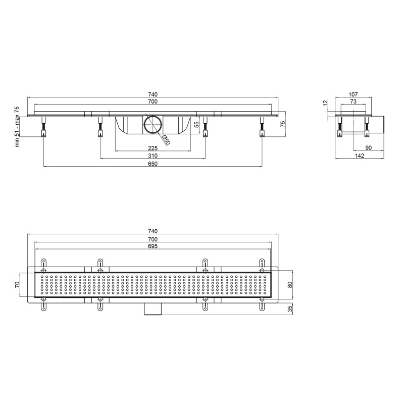 Лінійний трап Qtap FB304-700 допоможе облаштувати сучасну душову зону без застосування душового піддона, на рівні з підлогою. Корпус трапа виконано з якісного пластику сірого кольору. Дана модель виконана з прямокутною решіткою з нержавіючої сталі розміром 700х73 мм і має випускний отвір діаметром 50 мм. Сухий закрив не дає неприємному запаху проникати у приміщення з каналізації по трубах.