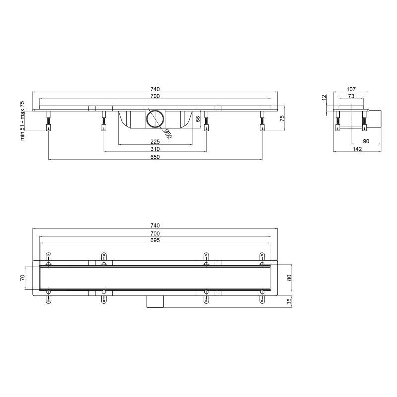 Лінійний трап Qtap Dry Tile304-700 допоможе облаштувати сучасну душову зону без застосування душового піддона, на рівні з підлогою. Корпус трапа виконано з якісного пластику сірого кольору. Дана модель виконана з декоративною накладкою 700х73 мм і випускним отвором діаметром 50 мм, яка виготовлена з нержавіючої сталі і за необхідності перетворюється у лоток під укладення керамічної плитки. Завдяки сухому закриву неприємний запах не буде проникати в приміщення з каналізації.