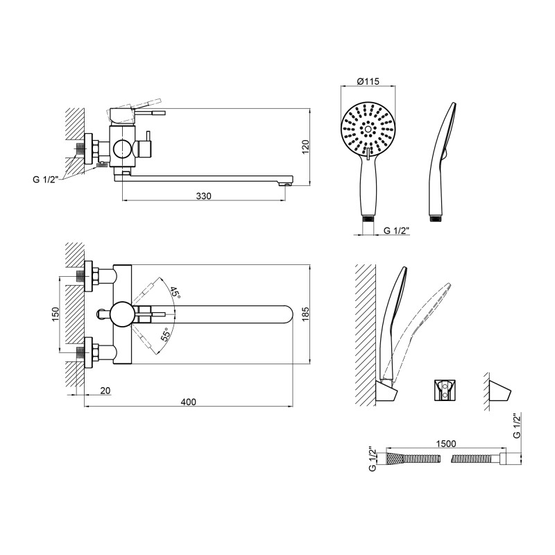 | Дополнительные характеристики | Утримувач для ручної лійки має 2 положення. Габарити лійки для ручного душу: 235х80х60. Довжина душового шланга – 1500 мм. |