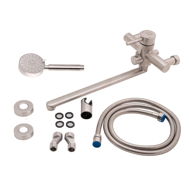 Змішувач для ванни Lidz (NKS) 12 32 005-1 виконаний з нержавіючої сталі, що гарантує тривалий термін експлуатації. Для вмикання подачі води досить підняти важіль і повернути його в необхідний бік. Змішувач монтується на стіну над ванною за допомогою кріпильних елементів, які комплектуються разом зі змішувачем. Круглі розетки приховають похибки установки на обробці. Тримач лійки також кріпиться на стіну. Таким чином, ваші руки будуть вільні під час прийняття душу.