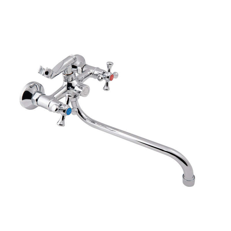 Змішувач для ванни Lidz (CRM) 75 21 140S New з довгим поворотним виливом виконаний з інтегрованим шланговим під‘єднанням, укомплектований душовим шлангом і лійкою. Для вмикання потоку води передбачено два вентиля з нанесеними маркуванням Х+Г води і фірмовими логотипами виробника. Для перемикання на душ - поворотний дивертор. Настінний монтаж здійснюється за допомогою кріпильних деталей, які комплектуються разом зі змішувачем. Круглі розетки приховають сліди установки на обробці.