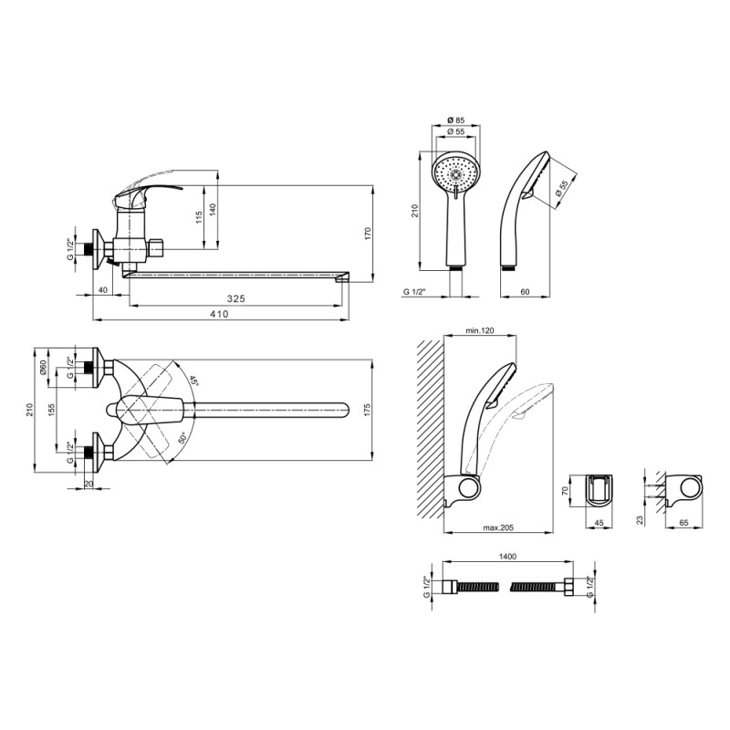 Дополнительные характеристики | Габарити лійки для ручного душу: 210х85х60. Довжина душового шланга - 1400 мм. |
